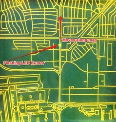Featured simulated green-phosphor display incorporating a flashing LED indicator that would advance along the map.