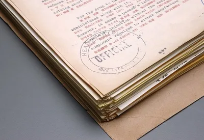 Subtle edge-aging of the documents was accomplished via airbrush.