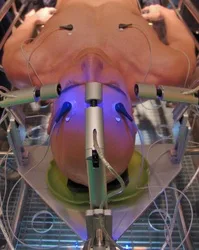 Apertures in forehead were rigged to emit blue liquid.