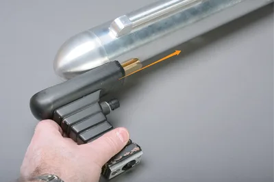 The front of the power pack is first positioned, with one end inserted into a stop located near the barrel coupling...