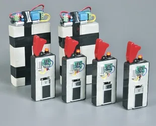 The 2 background devices had mobile phones attached when they appeared on-camera, and featured flashing LED "ARMED" indicators.The foreground devices were conceived to be set to detonate shortly after being armed, and were intended to be thrown like a hand-grenade.