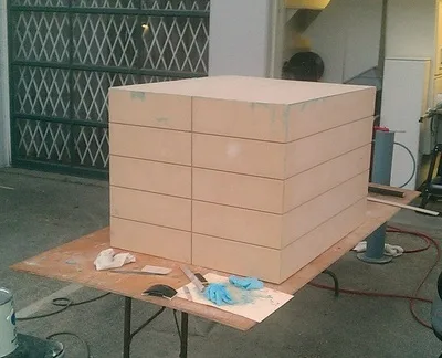 When it came to assembling the panels together, Pete suggested that we use some low-density auto-body filler that we had on hand as an adhesive. I liked this idea very much, because of the added benefit of the gap-filling at the corners that it would provide.