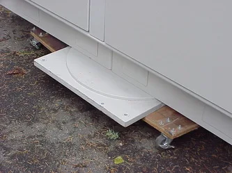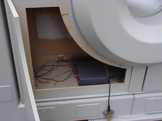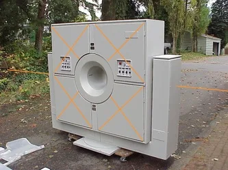 Rear of imager unit. This side also includes 4 hinged access panels. Interior access is required to remove or attach the rear aspect of the aperture tunnel. Once removed, the remaining component becomes narrow enough to pass through most doorways.