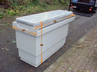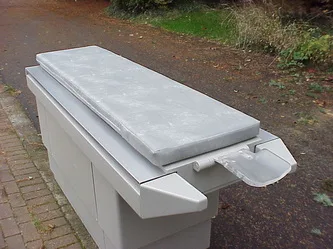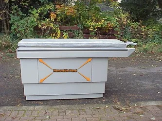 Patient platform - side view. A large panel on this side is designed to be removed to allow a person to be concealed inside the patient platform unit. This individual can then manually move the bed pallet in or out as required to simulate powered operation. (The bed pallet can be easily moved as it rides upon low-resistance bearings.)