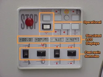 Only 2 of the switches (per panel) are operational. (The black toggle switches are solid-cast resin.) LCD displays are simulated/non-operational.