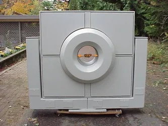 Imager unit - right side. 4 large hinged doors permit access to the interior of the unit. The "yoke" assembly is rigged to allow pivoting of the entire imager unit at its horizontal axis. This is accomplished with the assistance of off-camera stage hands who position the unit manually. (This is a powered function on the real machine.)