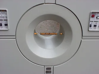 Imager unit aperture detail. Some productions have rigged "registration mark lasers" to authentically illuminate the registration the marks typically applied to the patient's head. This is accomplished by situating 2 common red laser pointers to the inside of the aperture tunnel that are aligned to shine through the "X" shaped openings located on either side.